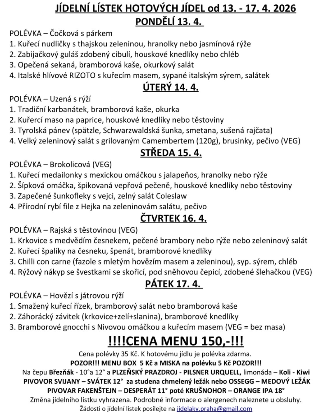 Nechejte se překvapit naší českou kuchyní. Každý den pro Vás pečlivě připravujeme čtyři chody poledního menu s různými přílohami a jednu polévku. Nechejte se hýčkat nabídkou znamenitých pokrmů. Na výběr máte i nesčetné množství osvěžujících nápojů. Naší vášní jsou různá pivečka. Připravíme Vám i Vašim přátelům příjemný večer plný chutných zážitků. Večer Vám připravíme dobrůtky k pivu ze studené kuchyně. Domácí Nákládaný Hermelín se sušeným ovocem a ořechy nebo Utopenec to je naše doména. Díky internetu zdarma můžete u nás bez problémů surfovat klidně celý den.